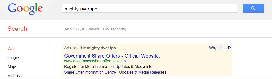 When NBR searched for "Might River IPO", the Government Share Offers site topped the list of results (with the faintest of faint backgrounds that Google uses to denote a paid placement):