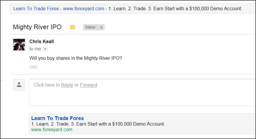 A Gmail discussing the Mighty River IPO was less successful, producing a series of text ads for a foreign exchange site: