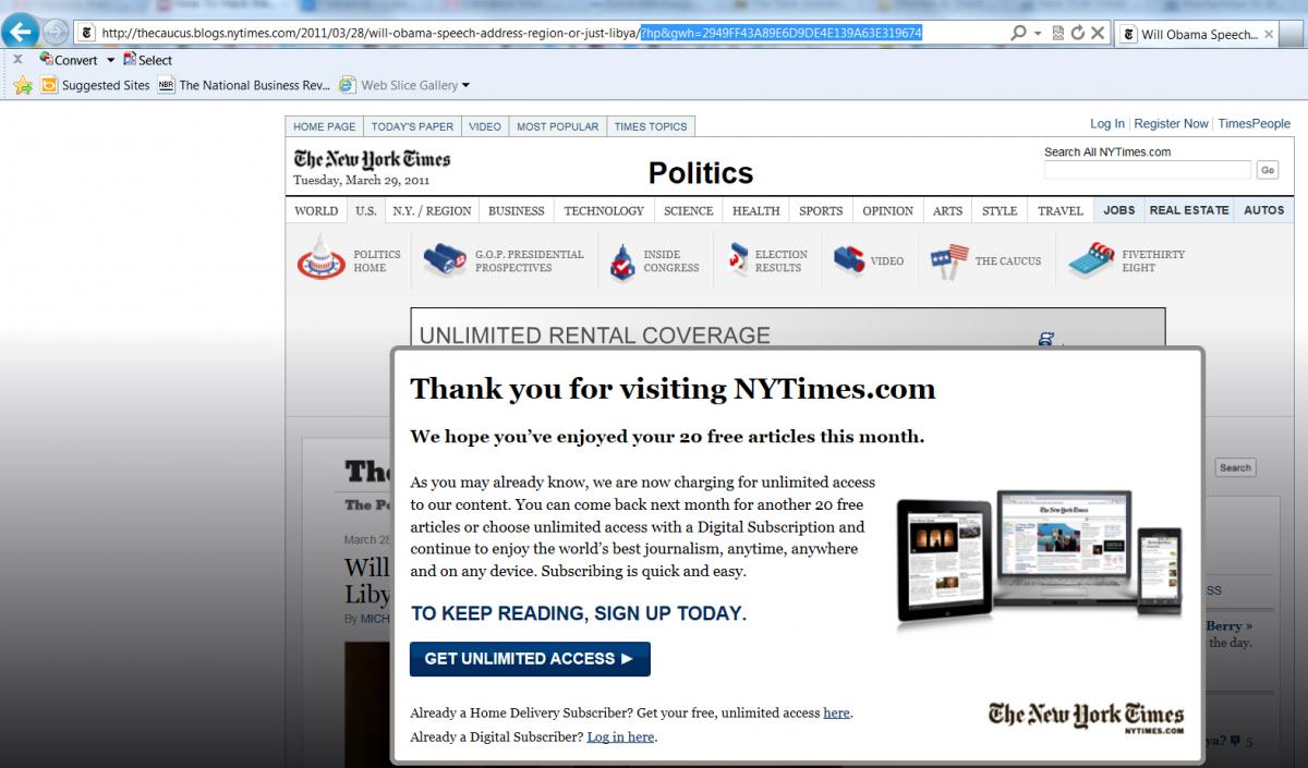 Pre-launch, various geeks claimed they could hack the NYT paywall, which was being trialled in Canada. But that seemed all by-the-by, given their geek tips involved authoring lines of JavaScript.
