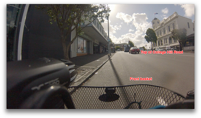 Here she is nearing the top of College Hill Road. She is not very big and goes pretty quickly up hills — and enjoys passing the occasional middle aged man in lycra. She sometimes does that when those baskets are full of groceries.