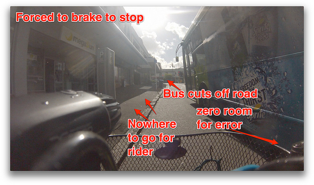 Perhaps it would have been safer to graze or hit the car than to risk squashing an unprotected rider – a potential judgement call that should be discussed in an incident investigation, but clearly won’t be because this incident is a sadly regular occurrence for both buses and cyclists, and they are never investigated as far as I can tell.