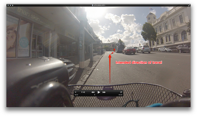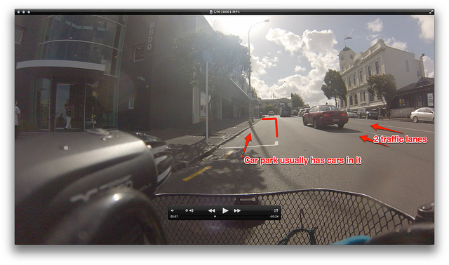 She is approaching a carpark – and as there are no cars today she had a clear run. This is great as normally the parked cars force her into the often fast moving traffic that is chaotic due to a complex intersection ahead. This, by the way, is on the safest route she has found to get some exercise while riding home.