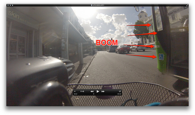 A few seconds later the bus and the bike have braked almost to a stop – but look how far it took the bus to do so.