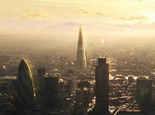 Above and below: Near neighbours London Bridge, St Paul's and the Swiss Re Building (popularly known as The Gherkin); The Shard from above. Sellar Property Group and inhabitat. Click to zoom.