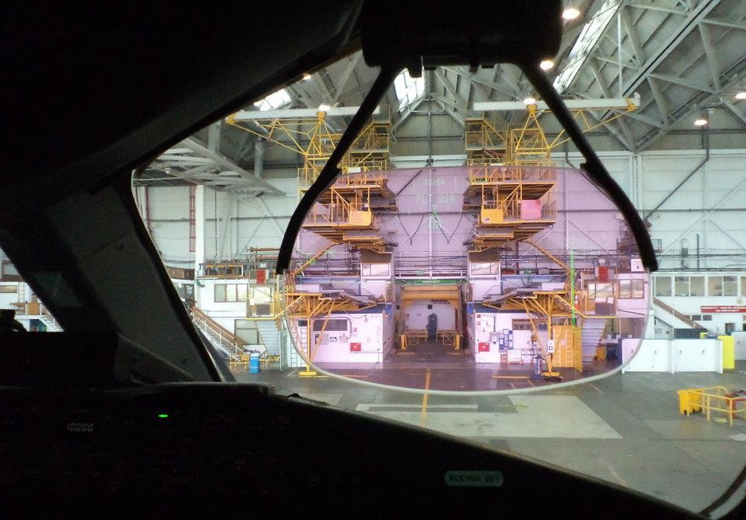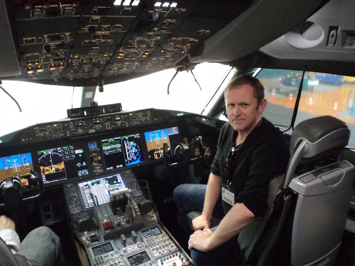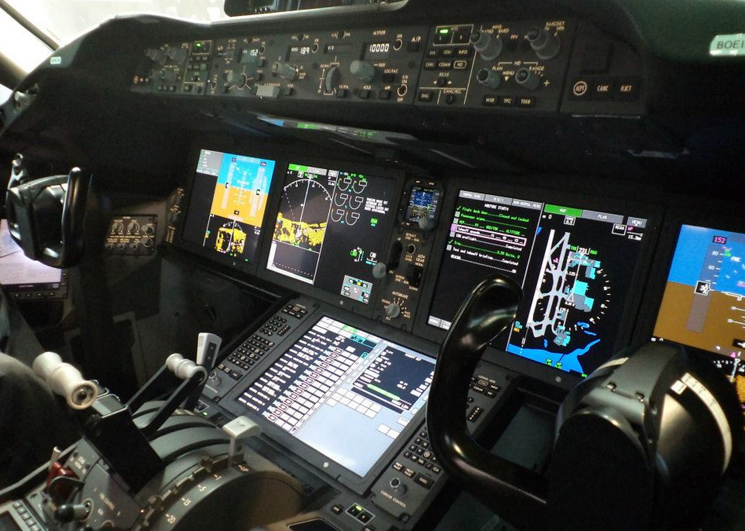 "Up front, the yoke and throttle arrangement Boeing has used since the 707 is still there, leaving computer game-style sidesticks to competitor Airbus. The big difference though is the bank of LCD displays: four big ones across the panel, with a slightly smaller one each side.