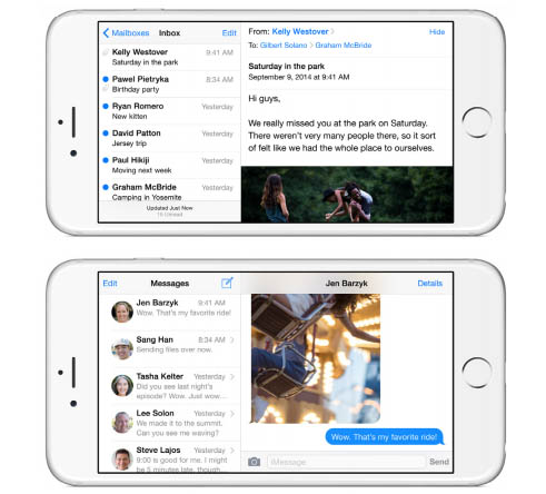 3. But, but, but ... the Plus makes really good use of its bigger screen/extra pixels: For the first time apps behave differently depending on which iPhone you pick. On the 6 Plus, which has nearly twice the pixels of the 5S, when you hold the handset in landscape mode you get new split-screen viewing options in several Apple apps (pictured above). In Messaging, for example you have your inbox on the left, and a selected individual message display on the right of the screen. In calendar you can see both a weekly view on the left and the current day's appointments on the right, and so forth. The larger display is also just better for Safari's new tabbed browsing mode; for movies an games; and for existing swipe right/swipe left options to see more info in Mail or apps like Twitter.