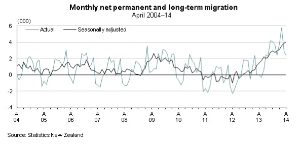 In the year ended April 30, New Zealand gained a net 34,400 migrants, as 98,800 people arrived while 64,400 departed. That's almost three times the average annual net inflow in the past 20 years and the highest since 2003. In the year, the net loss to Australia fell to 11,100, from 34,100 a year earlier.