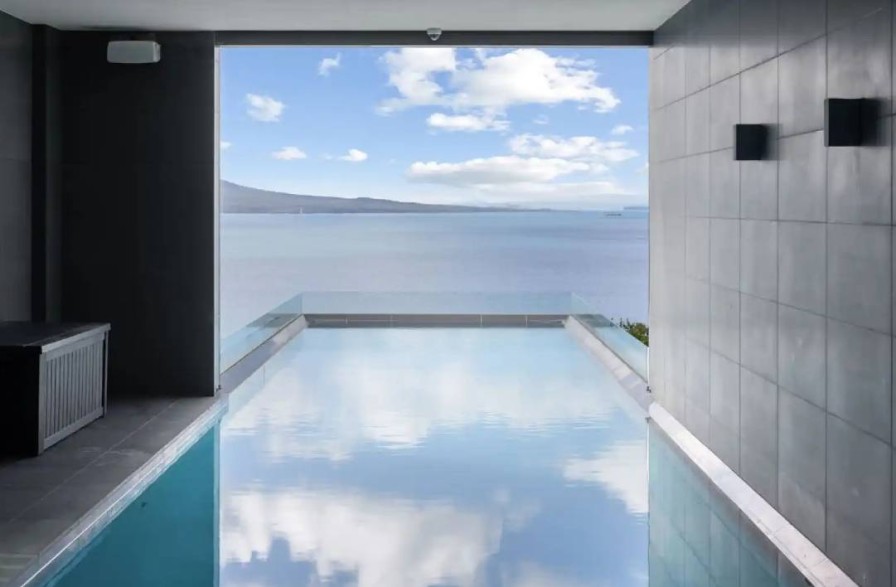 The 1400 sqm waterfront home – designed by Hulena Architects and built by Auckland Builders Good Brothers in 2014 – features six bedrooms, a whopping 10 bathrooms, and six car parks, as well as a 17-metre indoor/outdoor infinity pool.
