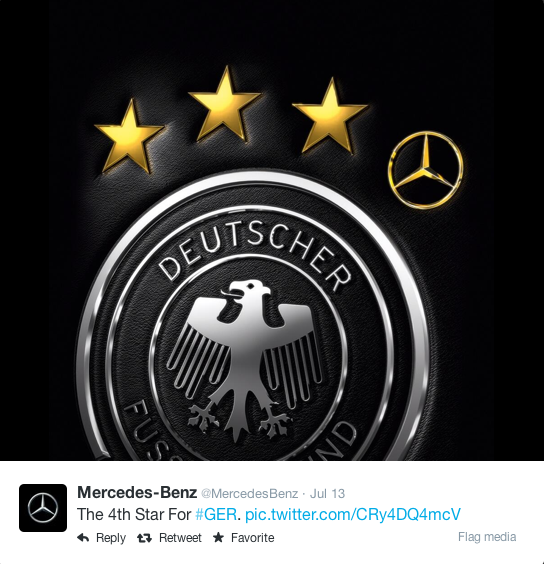 FIFA 2014 provided the opportunity for countless marketing stunts. Mercedes was quick to hop on the celebratory bandwagon. The German car company inserted its logo among four stars, signifying Germany’s four world cup wins.