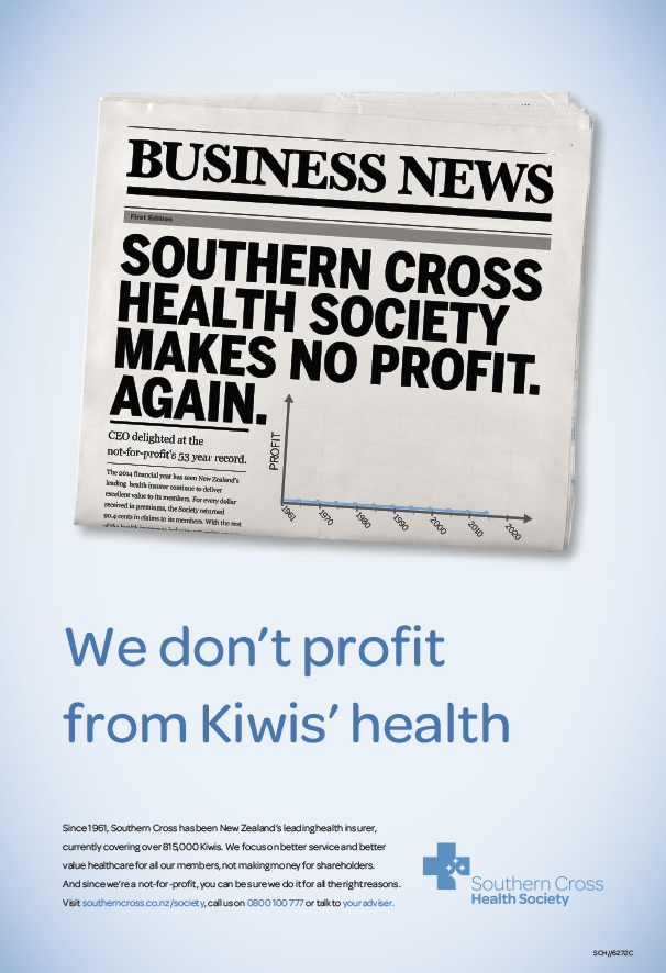 Barnes, Catmur & Friends is continuing its streak of striking print campaigns with this tongue-in-cheek Southern Cross ad. It featured in the National Business Review (print), Dominion Post and New Zealand Herald last week and is being republished this week. Barnes, Catmur & Friends chief executive Daniel Barnes says the complex topic of health makes print the ideal medium. He says it was a good way to remind people the organisation doesn’t aim to make a profit. The ad doesn’t tell the whole story – not only is the insurer not making profit, it has slipped further into the red – but its boss says he is comfortable with that.