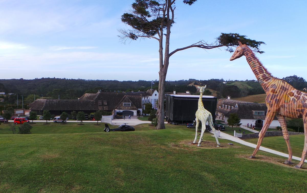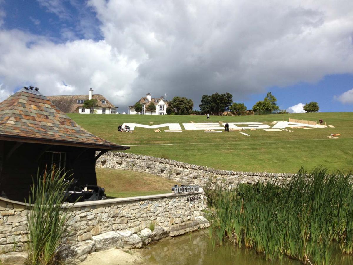 ABOVE: A giant "Mega" sign being constructed on the mansion's front lawn.