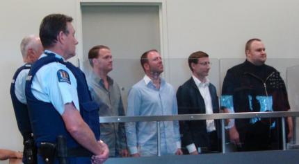 FLASHBACK: Kim Dotcom in the dock with (L-R) co-accused Bram van der Kolk, Finn Batato, Mathias Ortmannn after their January 20, 2012 arrest on copyright infringement, money laundering, racketeering and other charges associated with Megaupload and its alleged $US175 million in illegal profits and divereted $500 million revenue from content providers. In part because of procedural and legal blunders by the DOJ, FBI, GCSB and NZ Police, the case to extradite the four to the US has seen a series of delays; the latest has pushed it back to August this year at the earliest.