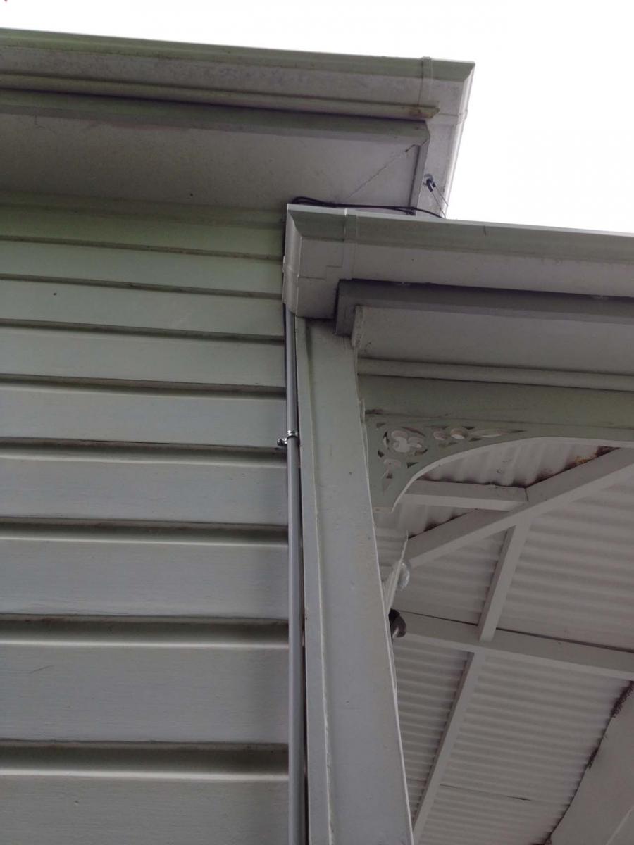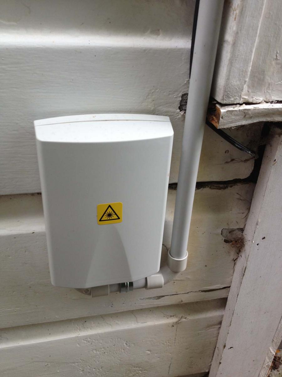 Above and below: the fibre cable, in a protective sheath is run down the side of the house to an external termination point (click photos to zoom).