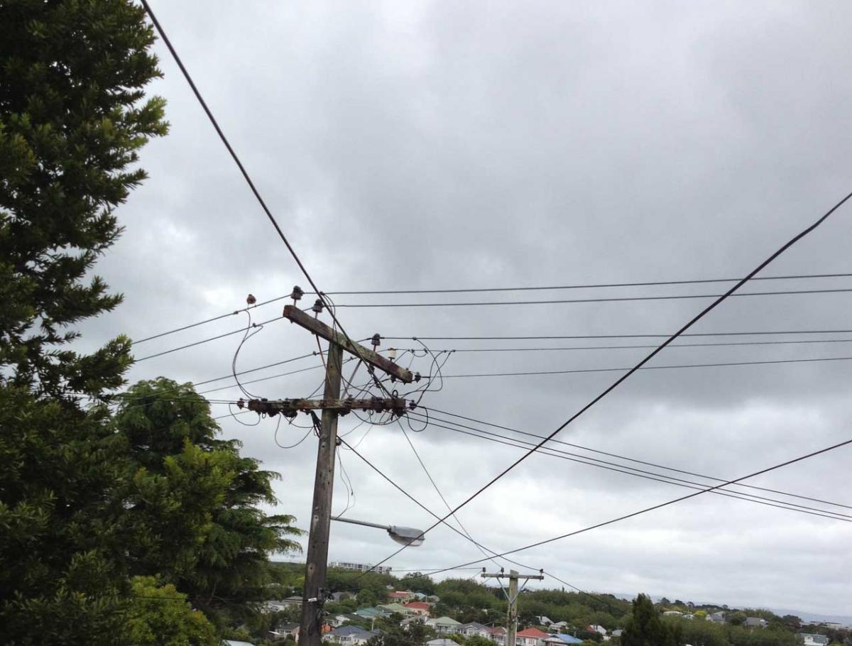 Fibre has been run down one side of our UFB trialist's Auckland street. He lives on the other side. So the fibre is slung overhead - in the same manner as phone lines in the street - to reach his house. It would of course be cleaner to run fibre down both sides of the street, but it is already costing Chorus an average $3200 to run fibre past each premise and as taxpayers we're chipping in $929 million to Chorus' for its 70% or so of the rollout (the money is repayable at the end of the 10-year project, but is interest free). And while it's not the cleanest solution, the fibre (the cable that stretches to the top right of the photo above) doesn't standout in the nest of power and phone cables that already snake around the street.