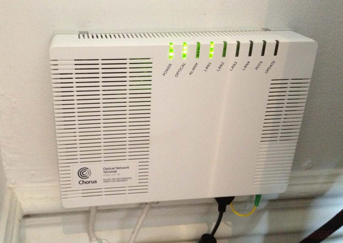 While all UFB accounts come with a VoIP (phone calls over the internet) service, it's notable this internal Chorus Optical Network Terminal includes a Pots (plain old telephone service) jack. Note also the the warning notice: "Please do not remove from this property."