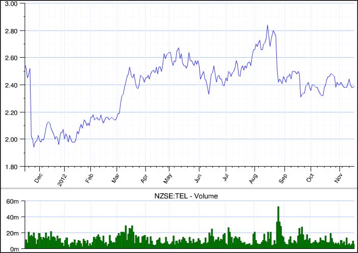 Telecom NZX performance since the Nov 11 Chorus spin-off. The company's shares took a hit in August after it announced a relatively buoyant result but suspended a buyback programme - apparently considering its own shares overheated. Source: S&P Capital IQ. Click to zoom.