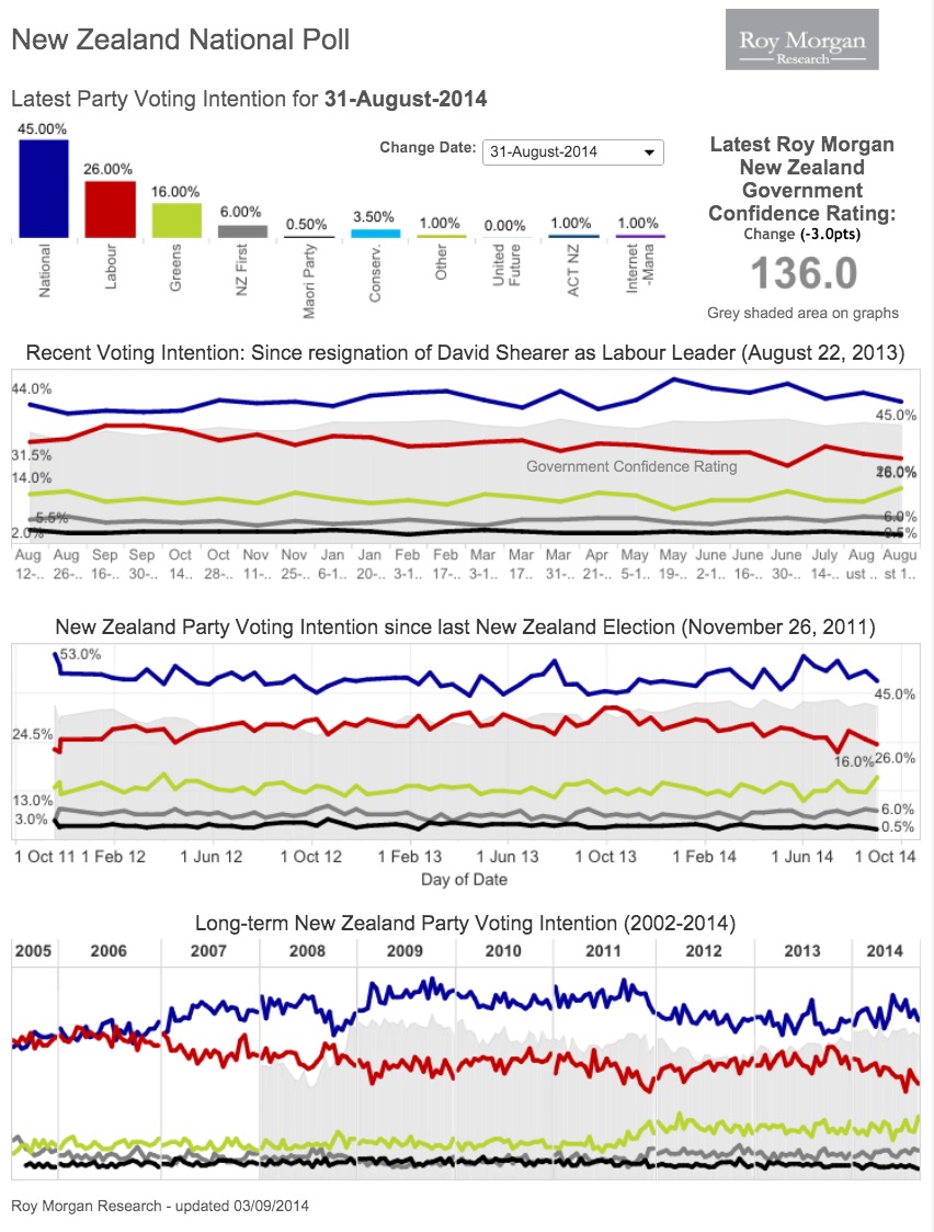 For its part, National has taken a three point knock to sit at 45 percent support, the lowest level of support at which it could realistically expect to be able to form a government. Roy Morgan conducts a rolling nightly poll, so the result covers the views of 762 people polled in the period Aug. 18 to 31, so picks up two full weeks of political reaction to the Hager book, but very little of the reaction to Key's move against Collins, which saw her resign last Saturday, Aug. 30. (See graph below)