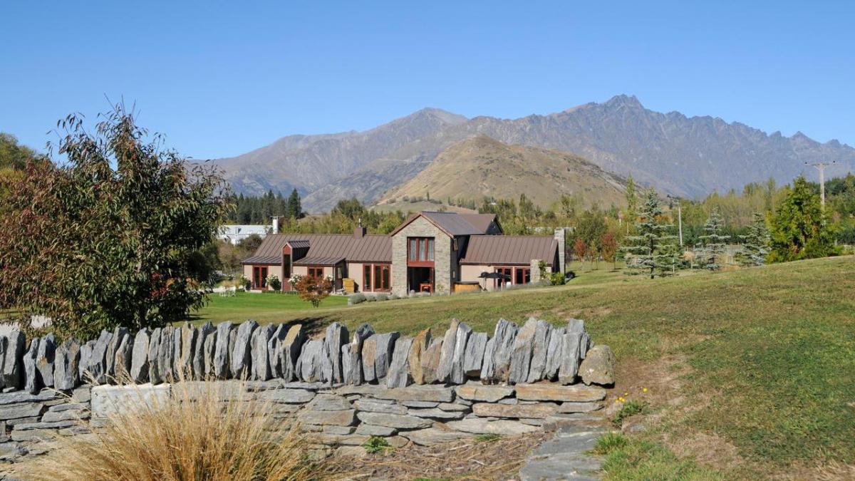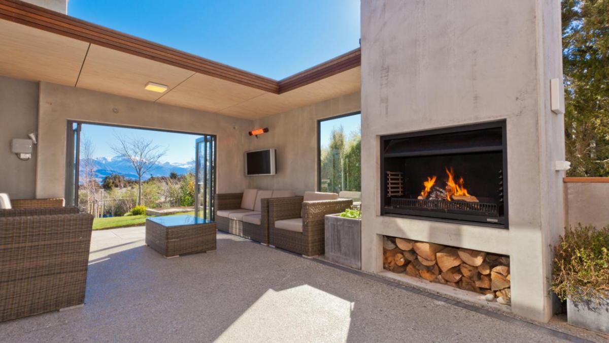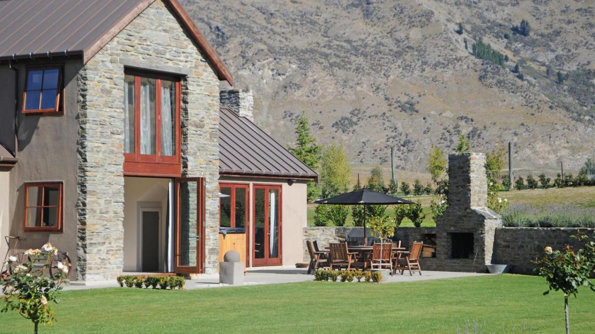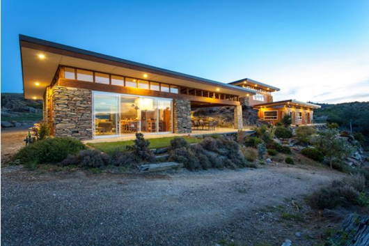 This is an award-winning home starring textured concrete panels and cedar features. It overlooks Lake Wanaka and the Treble Cone ski fields. The partially covered outdoor living space boasts a open fire/barbeque and flat screen TV. There is also a grass tennis court and outdoor spa. View full listing here.