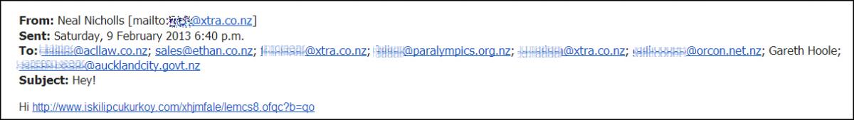 ABOVE (click screenshot to enlarge): A graphic example of the Yahoo Xtra email hack, and the way a user's mail account can be hijacked without them going anywhere near their inbox (as opposed to foolishly clicking on a malicious link to compromise themselves - although that techique is being to spread the Yahoo vulnerability). An NBR reader received the above email from the Xtra address of one Neal Nicholls. Keen readers will know the former Capital & Merchant Finance director is currently a guest of her Majesty. And, no, prisoners are not allowed email or internet access.