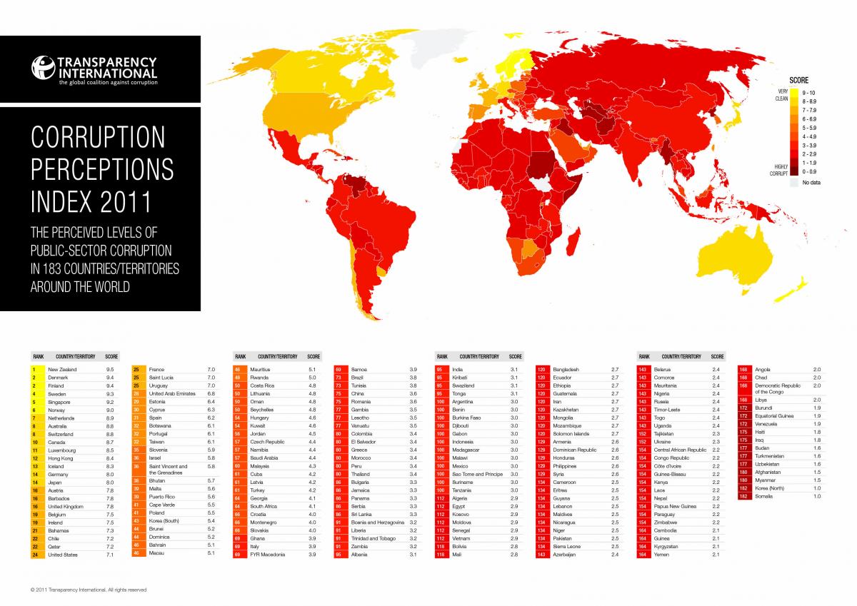 This is according to Transparency International’s just-released Global Corruption Perceptions Index. New Zealand last year tied for first place with Denmark and Singapore, with Finland and Sweden close behind (see infographic below for 2011 listings, click to expand).