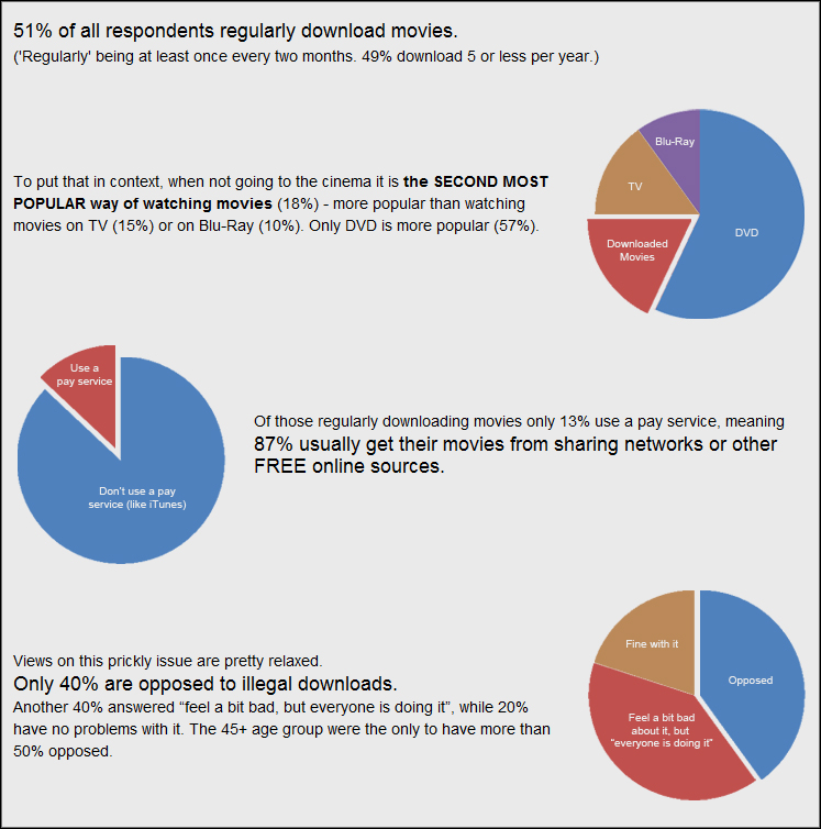 The headline stat is that 51% regularly download movies, but 87% don’t pay (see charts below).
