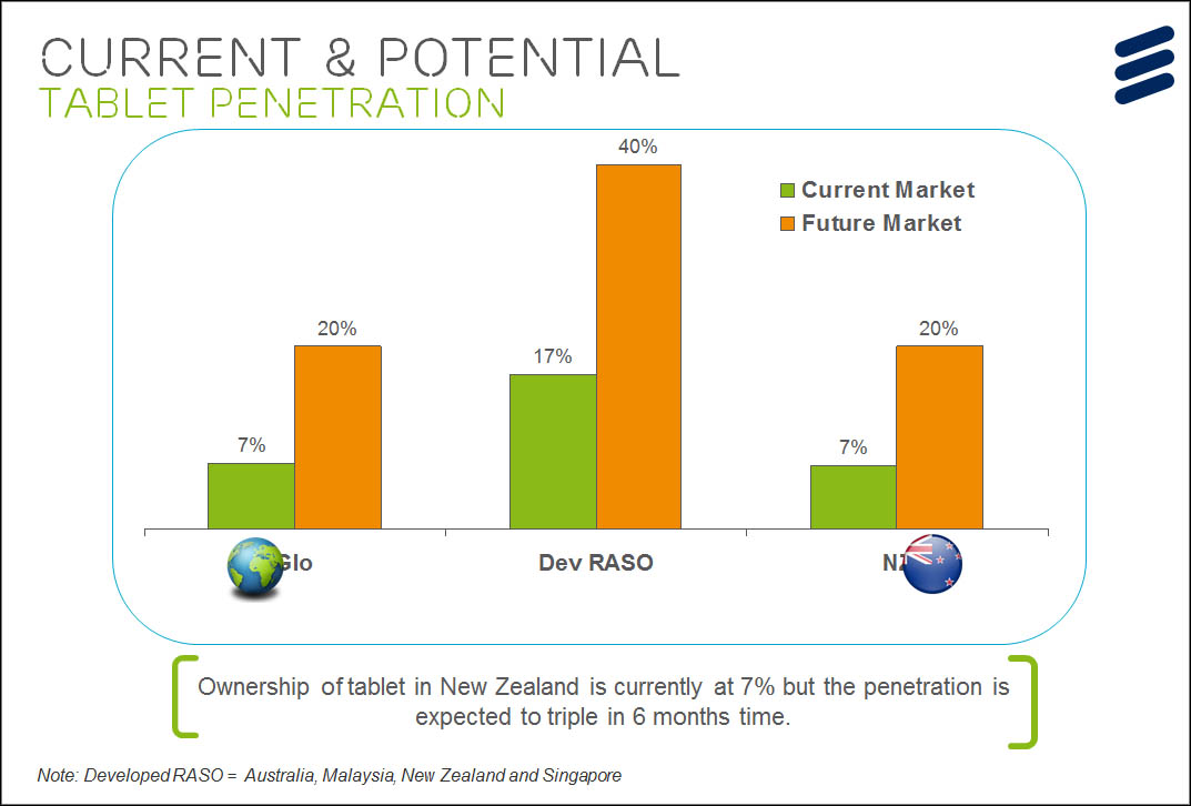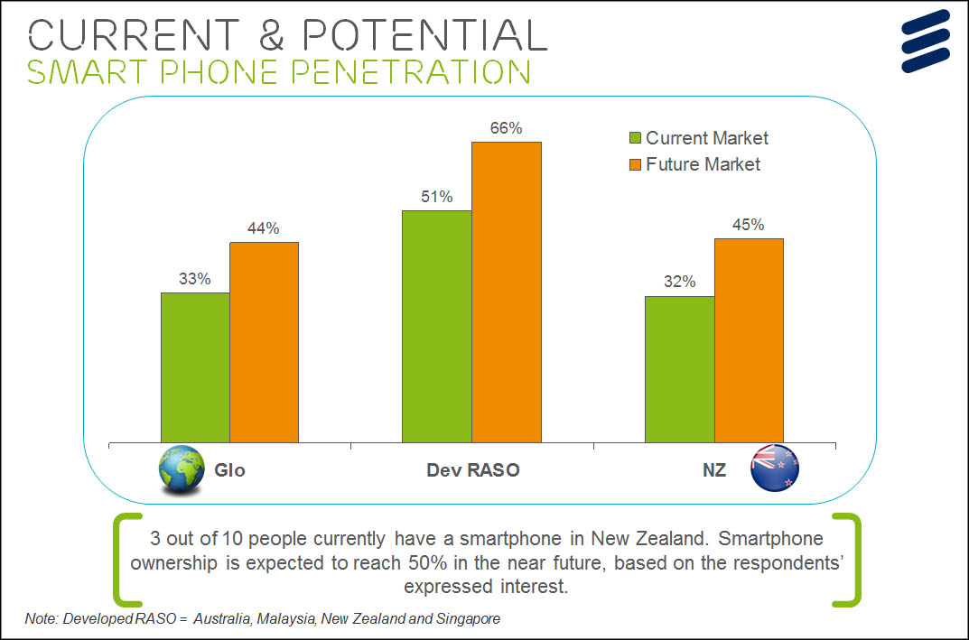 The Ericsson figures compare New Zealand uptake of smartphones and tablets with Australia, Singapore and Malaysia, where penetration rates are ahead of world trends, with 51 percent of users currently carrying a smartphone and two-thirds expected to be doing so by the end of the year.