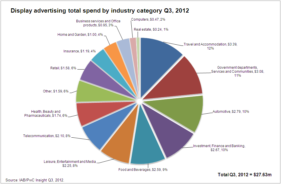 Online display advertising by category. Automotive pushed into the top three during the quarter, with banking and finance dropping to fourth. Click to zoom.