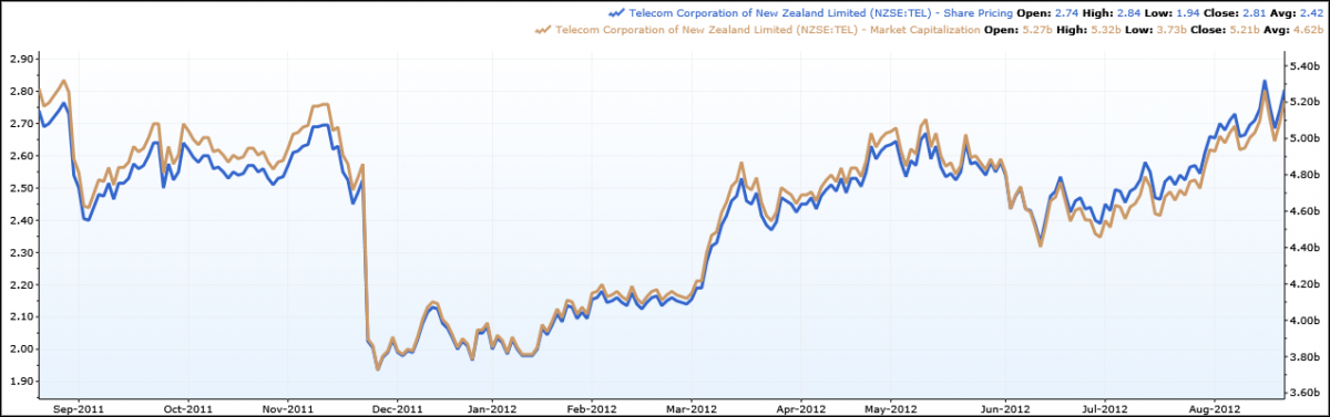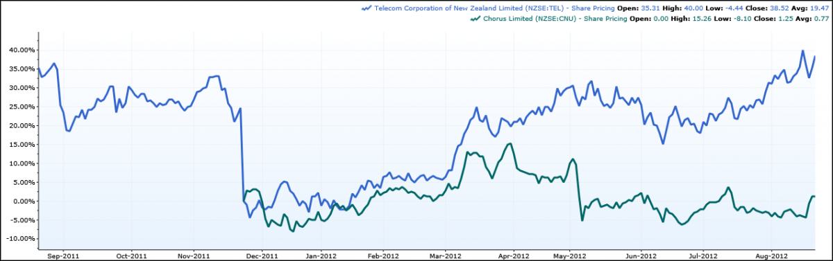 Telecom 12-month NZX performance. Chorus was split off in Nov 11. Source: S&P Capital IQ. Click to zoom.