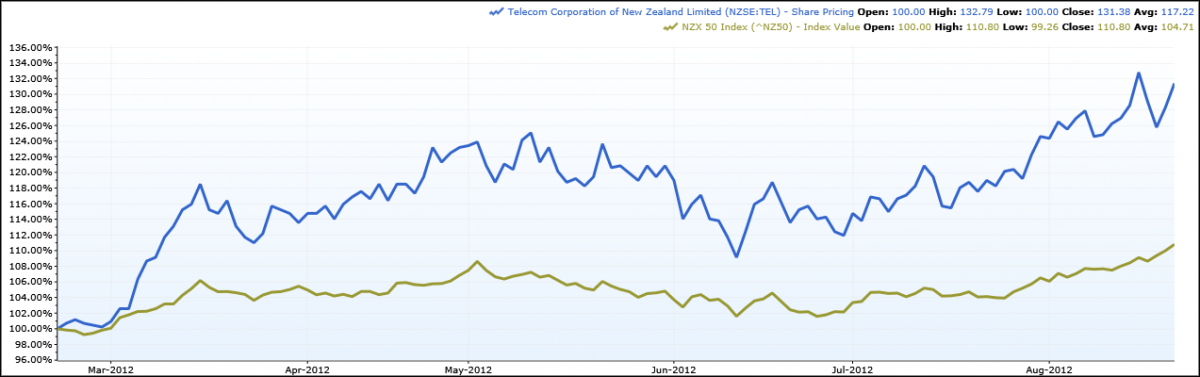 6-month NZX performance: Telecom (blue) vs NZX50. Source: S&P Capital IQ. Click to zoom.