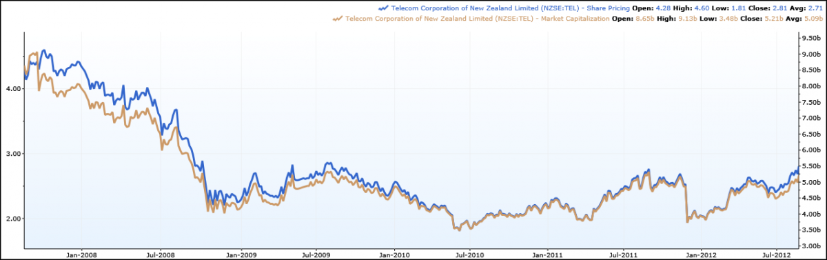 Telecom 5-year NZX performance. Source: S&P Capital IQ. Click to zoom.