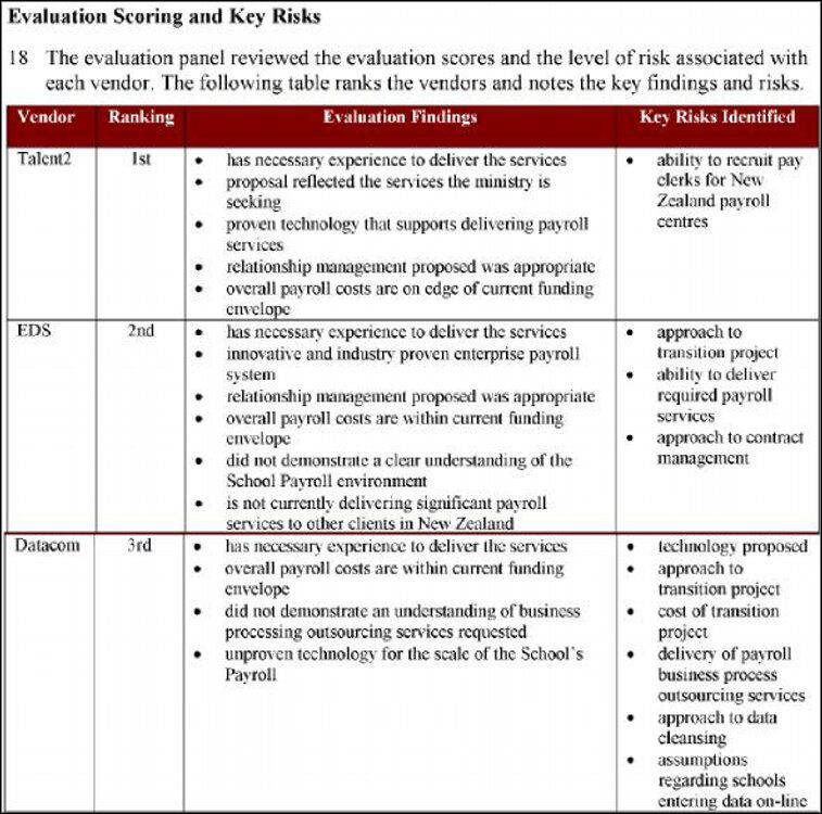 ABOVE: Among the documents leaked today was this table (of unknown date) that ranks three contenders for the Ministry' payroll contract: 1. Talent2. 2 EDS (now owned by HP) and 3. Datacom. Talent2 was alwarded the contract in 2005. Click to enlarge.