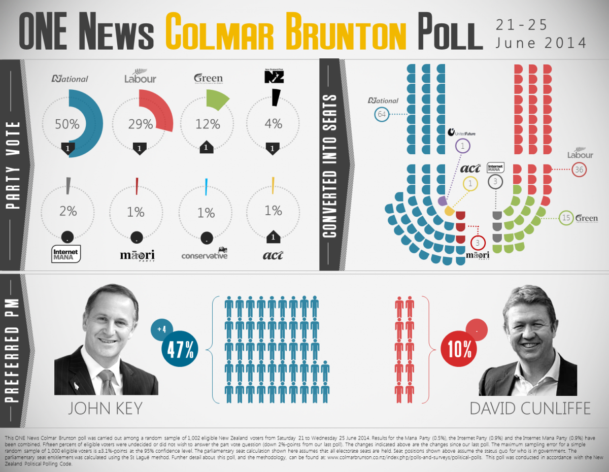 The poll also had National down 1 to 50%, which would translate to 64 seats or enough to govern alone.