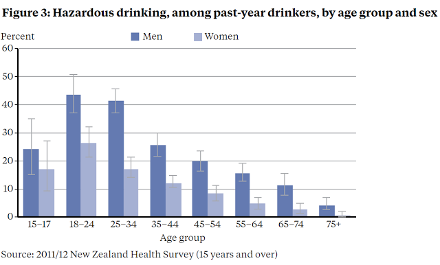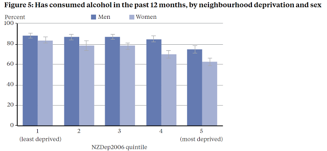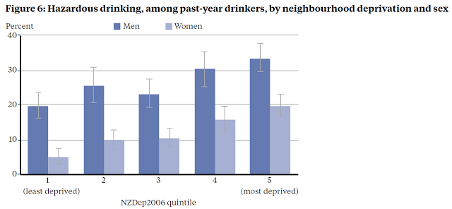 If we look at income patterning, richer people are more likely to have consumed alcohol in the last year but, conditional on consuming alcohol, poorer cohorts are more likely to report hazardous drinking. Netting the two effects, MoH reports, "As a proportion of all adults, about 18% of those living in the most deprived areas and 11% of those in the least deprived areas had hazardous drinking patterns."