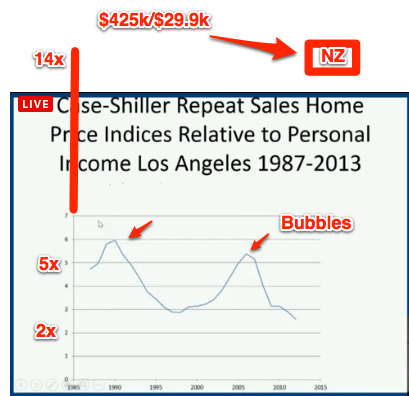 The chart that Shiller showed above shows that the LA prices dropped by over 50% versus income from 2006 until now. My own take is that there is clearly also room in New Zealand for a very very steep plunge in house prices. It would need a catalyst, but let’s remember to not blame whatever that catalyst is, but the system of incentives that has delivered us this ridiculous and very dangerous situation.