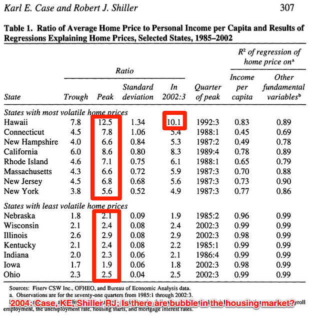 A bit more searching and I found the 2004 paper where Case and Shiller asked “Is there are bubble in the housing market?“, and showed that while for most US States the housing prices were directly related to income, but a few (about eight) states were well out of whack, showing more volatility along with higher average ratios.