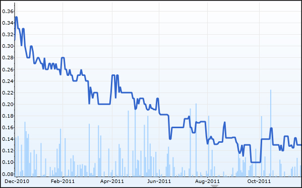The company is now at the bottom of its 52-week trading range of 35 cents to 10 cents.