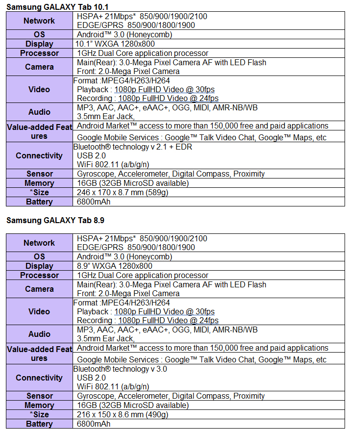 Now the company says it's set to launch two new models in its Tab series in May, both through Vodafone*: a 10.1-inch screen model, and a 8.9-inch model. Both are billed as thinner than Apple's iPad (see full tech specs below).