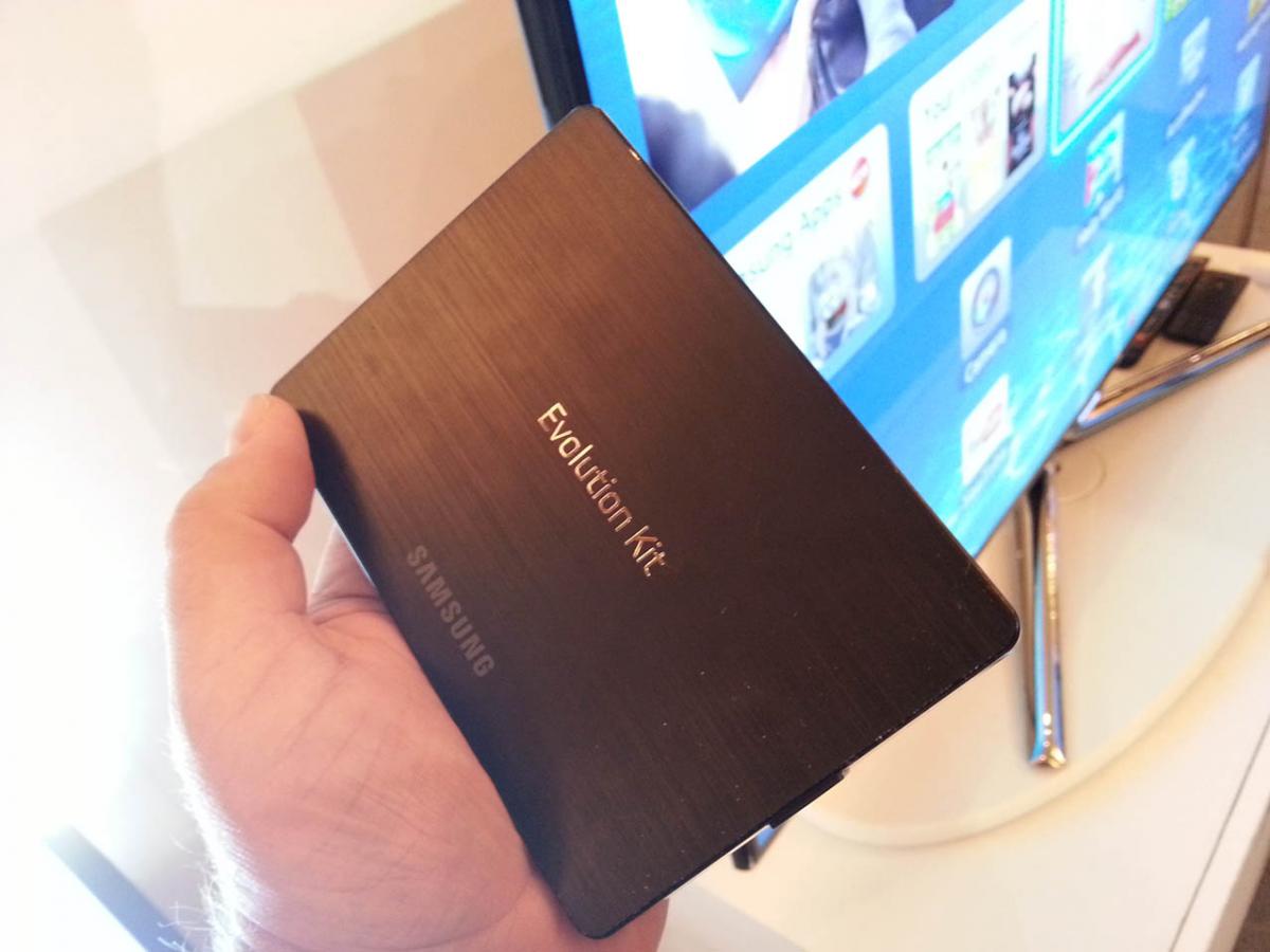 Here's where things get intriguing. Above I'm holding the Evolution Kit - a black box that can be used to upgrade a recent model Samsung Smart TV, giving it quadcore processing power, more memory and the latest software.