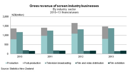 Total revenue for the sector was $3.15 billion in 2013, down from $3.29 billion a year earlier, according to Statistics New Zealand. The screen industry includes feature films, production, television broadcasting, distribution and movie screenings.