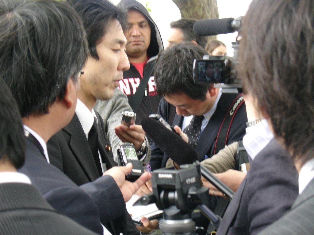 A Japanese delegation talks to foreign news media at today's service. Many of the 115 casualties in the collapsed CTV building were foreign students