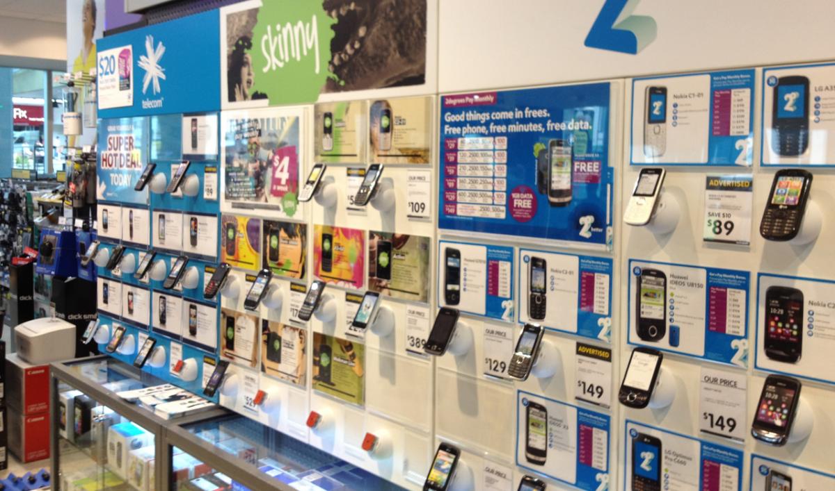 ABOVE: A Skinny retail display at a Dick Smith store (click to zoom). The new sub-brand is occupying the space formerly taken by Vodafone, which disappeared from the troubled chain last year following a commercial spat.