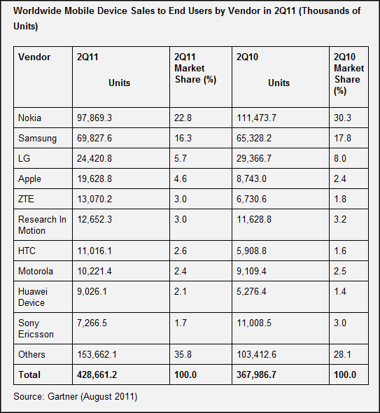 A recent Gartner market survey said Sony Ericsson accounted for 1.7% of all global mobile phone sales between April and June, compared to 3% share the previous year.