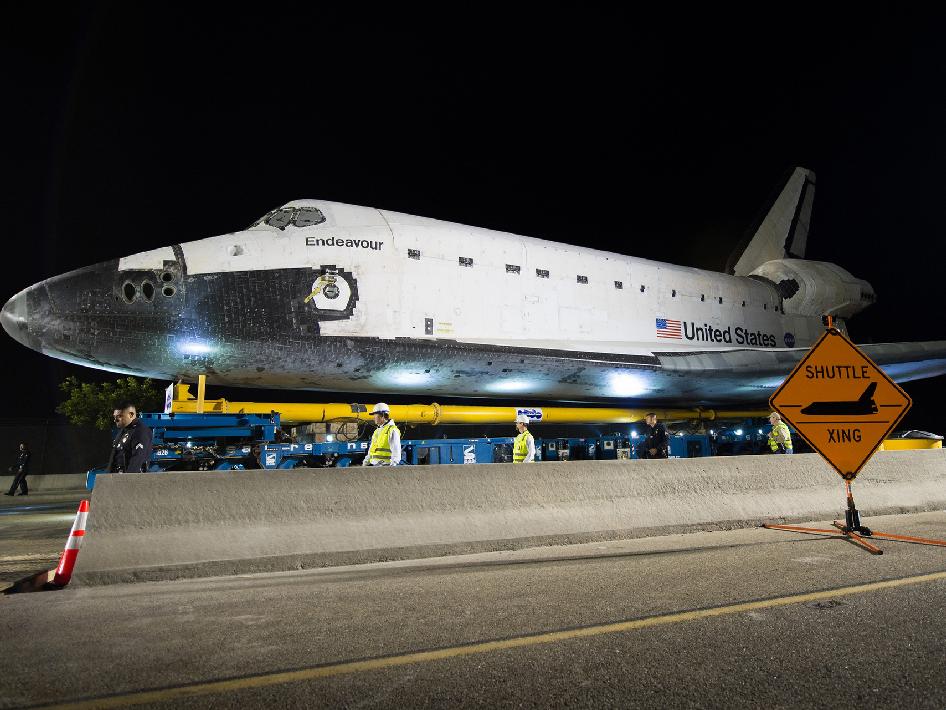 Oct 14: The Space Shuttle Endeavour was towed slowly through LA today, and into the evening, on its way to its final resting place at the California Science Center.