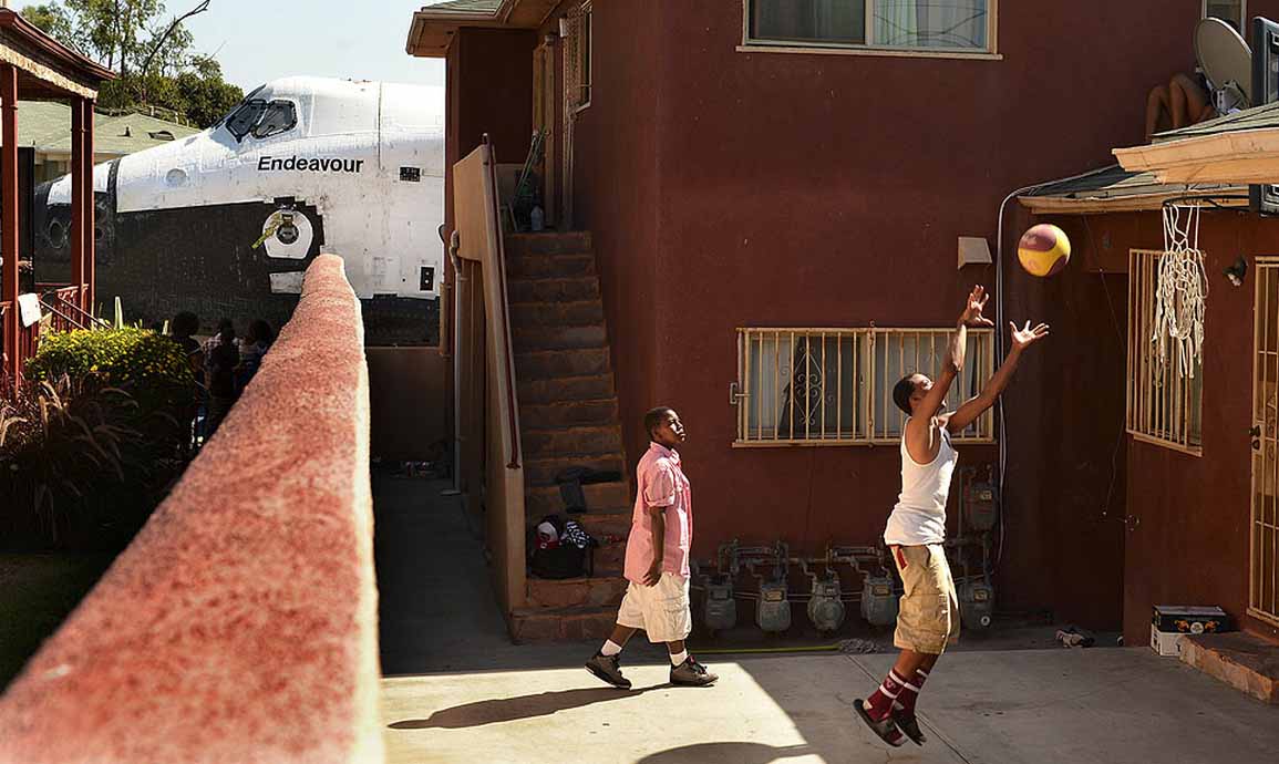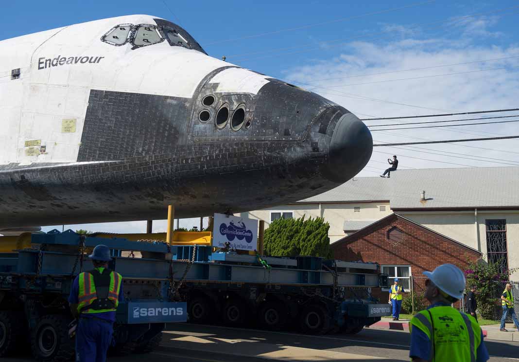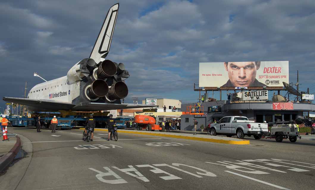 UPDATE: Houston, we have a problem: the shuttle proved too wide for several streets on its route. It is now on its second day of crawling through LA. Trees are being cut down to make way for the Endeavour.