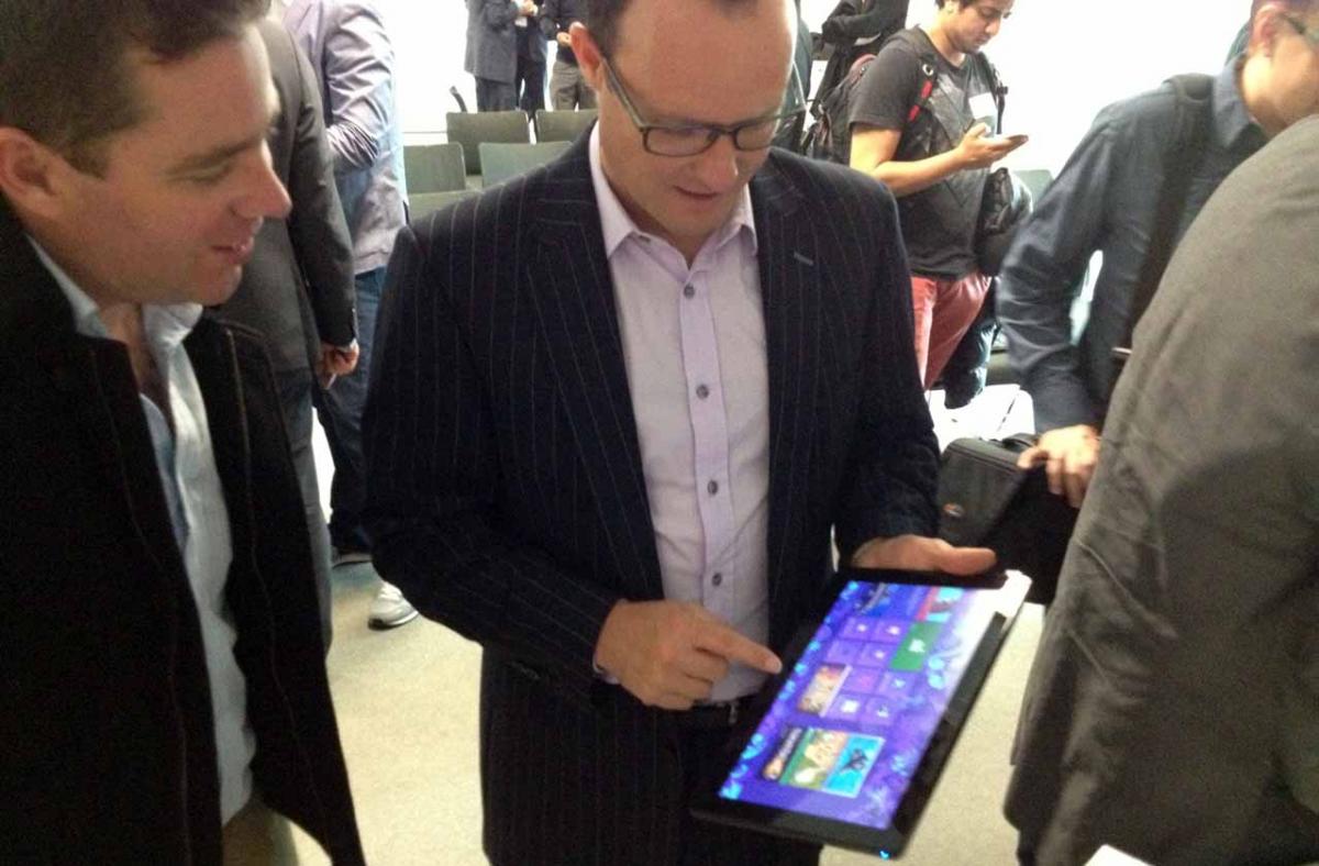 Microsoft NZ manager Paul Muckleston at this morning's launch with a Samsung Slate upgraded from Windows 7 to the new Windows 8 (Samsung has no NZ release date for its Windows ATIV range of tablets and smartphones, but hopes to get them on the market before Christmas). Mr Muckleston says he can run all his PC software on the tablet running Windows 8. Microsoft sees this as a key selling point over the iPad with business buyers.