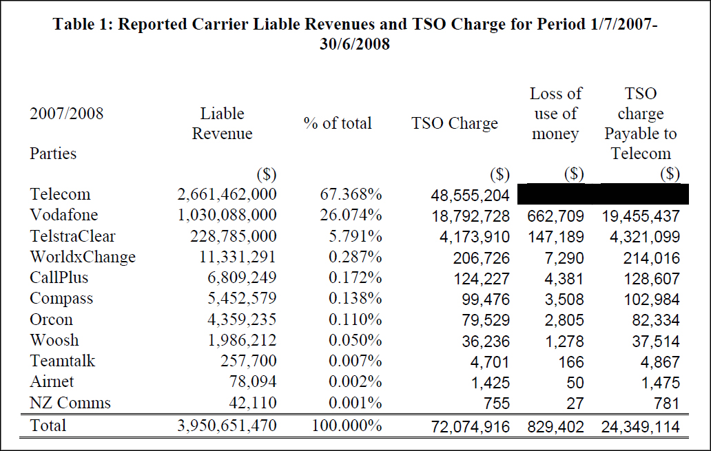 ABOVE (Click to enlarge): A typical year's TSO Levy payments, calculated by the Commerce Commission and paid by rivals to Telecom to compensate it for servicing so-called "commercially non-viable" rural customers. Telecom itself was the largest "contributor" to the now phased-out TSO, but only in the form of a notional, paper transaction. Vodafone payments ranged from $16 million to $20 million a year. TelstraClear's share of the levy ranged from $3.5 million to $4.2 millin per year. Other providers chipped in less than $250,000 - in most cases a lot less. The commission's TSO calculation's for 2001 to 2009 are online here.