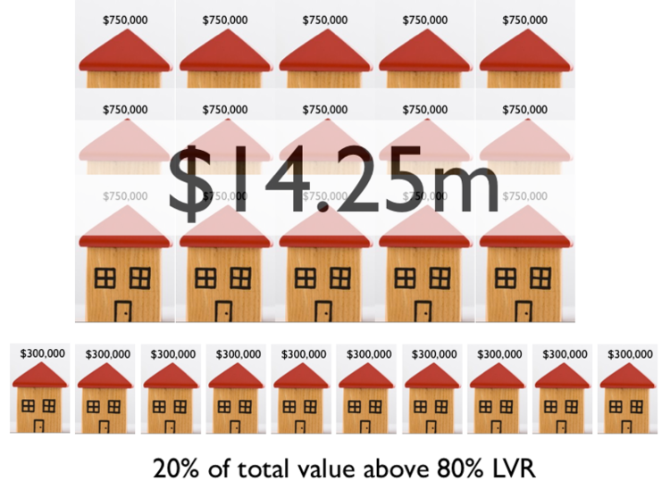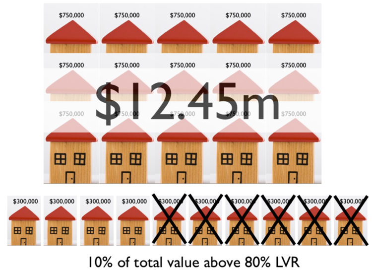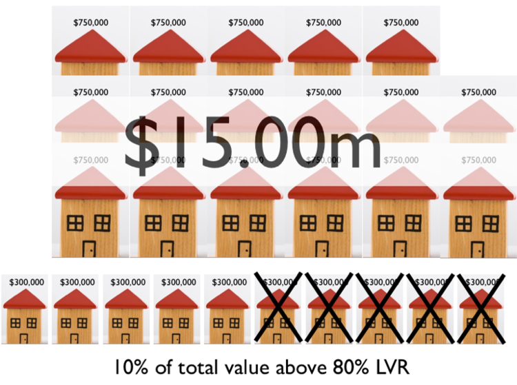 Lets say a bank as of last week has 25 prospective mortgage customers. 10 of those customers are after a 90% mortgage to buy a property and they all want to borrow $300,000 to fund that purchase of a $333,000 property. The other 15 customers happen to be customers with a larger portion of equity. They are looking to borrow $750,000 each to buy a $1.25m home – 60% LVR mortgage.