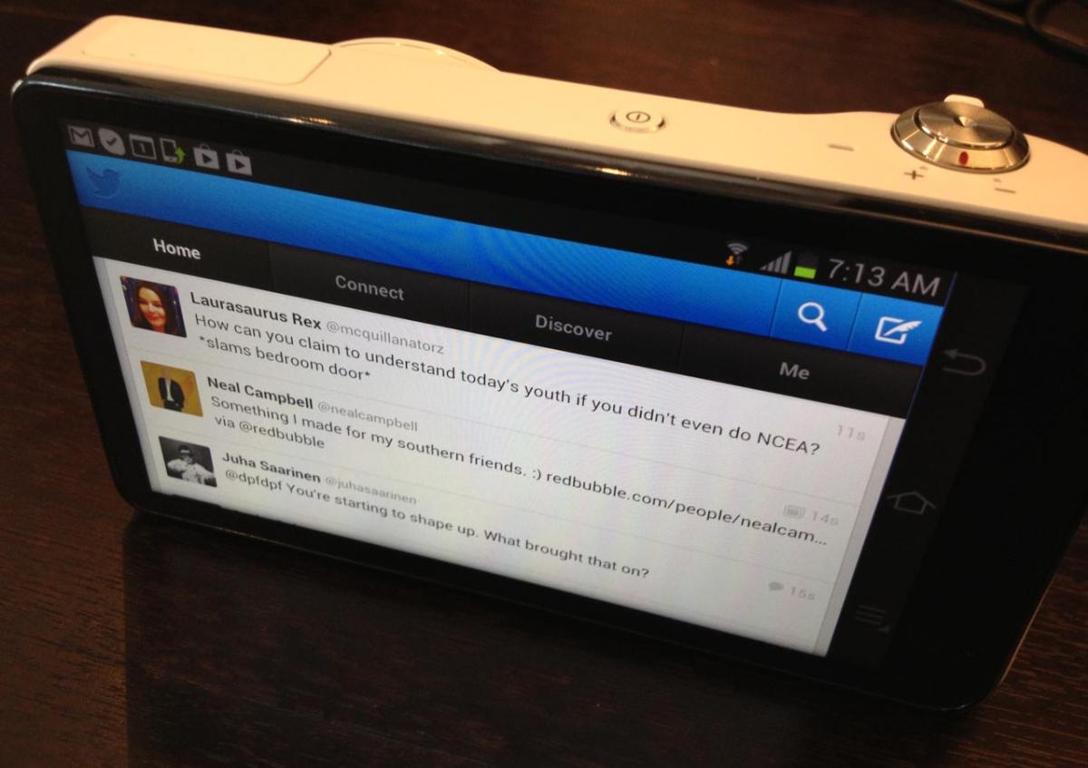 Its Google Android 4.1 operating system software and wi-fi/3G connectivity mean you can install any Android app on your Galaxy Camera. That includes Microsoft's Skype. I duly installed it, and got my beautiful assistant @caleballison (above and below) to call my cellphone. The sound was a bit muffled, but perfectly serviceable. And you can use Google Contacts to load all your numbers. Samsung doesn't promote this as a killer app, or at all. No-one's about to use a bulky compact camera as their day phone. But the ability to load Skype demonstrate's this gadgets extreme versatility. And it would be handy if you're in the field and your smartphone battery goes flat.