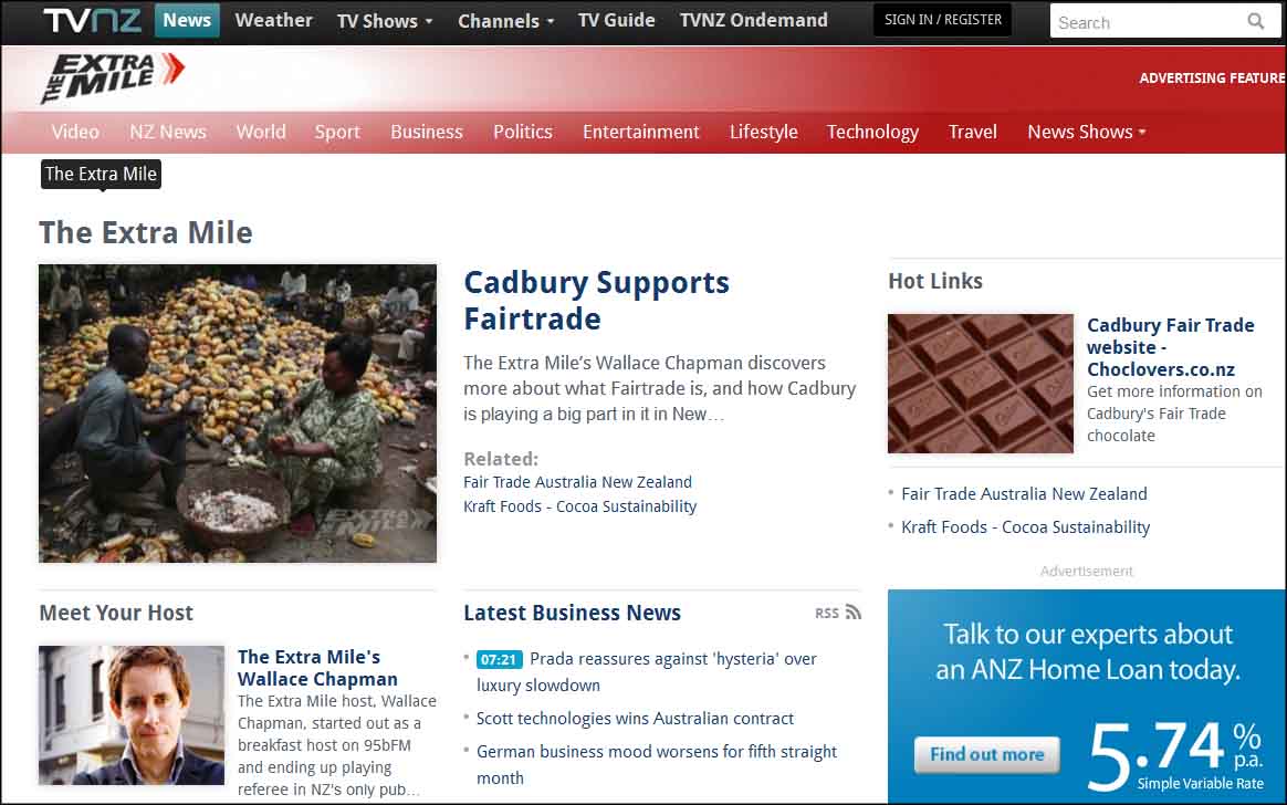 The page, part of the state broadcaster's new Extra Mile advertorial series, features interviews by Wallace Chapman, best known as the host of TVNZ7 political panel show Back Benches (shortly moving to Sky TV's Prime channel).