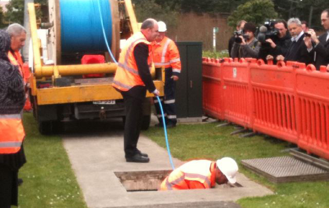 ABOVE: The minister lends a hand as the first Chorus Crown Fibre is laid in Albany, Auckland. But who's paying? (photo courtesy @TelcoKT).